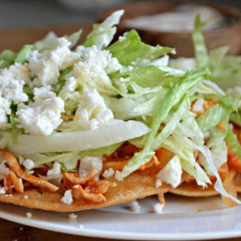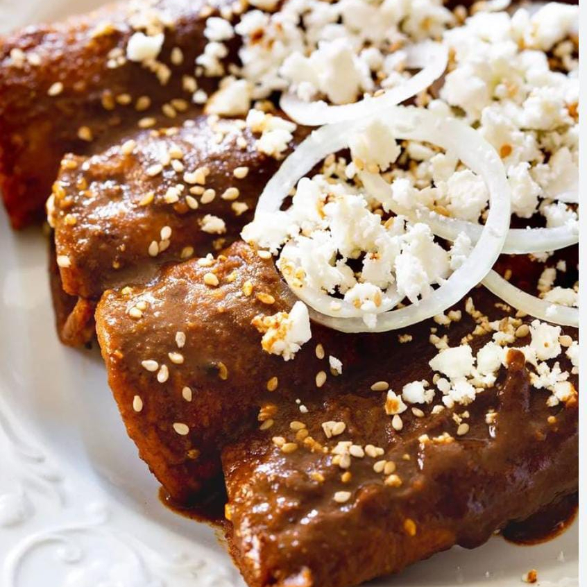 Fajitas de pollo bañadas en mole artesanal poblano y acompañado con queso, crema y lechuga.
