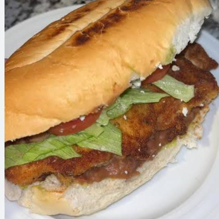 Telera, frijoles, milanesa de cerdo, aguacate, jitomate, lechuga y picante