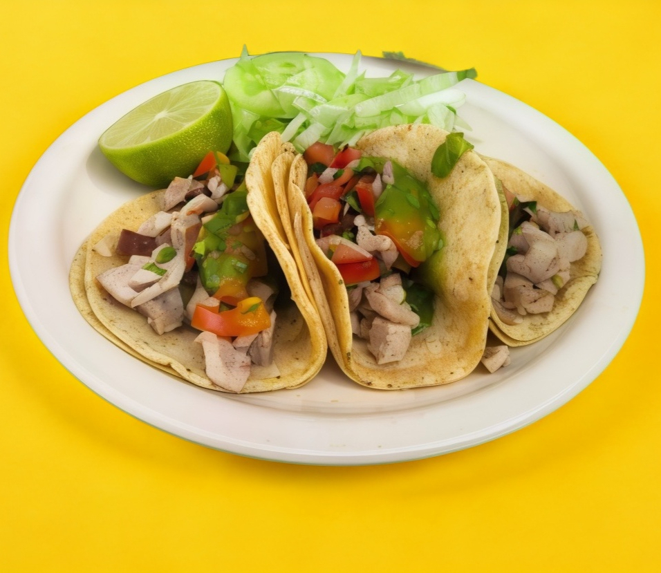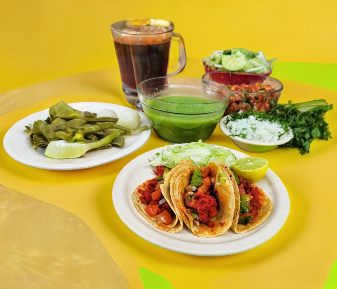 1/2 kilo de carne, 150gr. de tortillas de maíz, salsa verde, picadillo de gallo, lechuga, cebollines, nopales y limones.