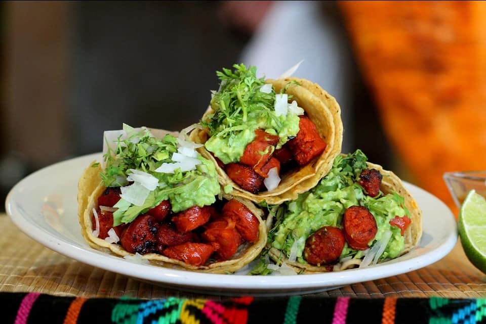 Taco de tortilla de maiz, cebolla, cilantro y aguacate. 75 gr aprox