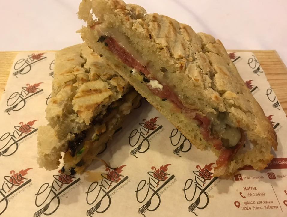 Crema de queso de cabra, cebolla caramelizada, mermelada de chile pasilla, calabacita asada, jamón ahumado y queso Monterrey Jack.