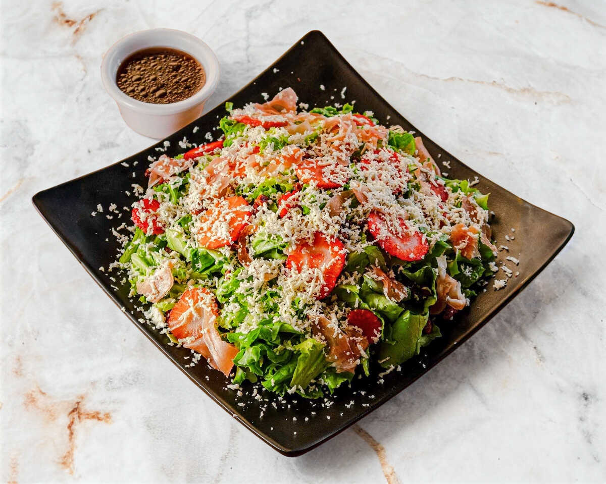 Lechuga, jamón serrano, fresa, queso gorgonzola, nuez garapiñada y vinagreta balsámica agridulce.