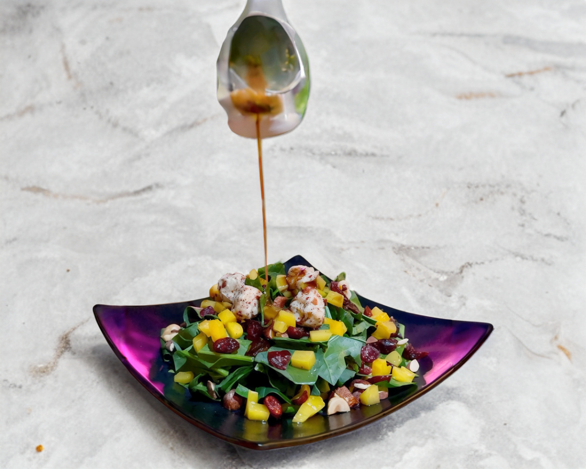 Espinaca, arándanos deshidratados, mezcla de nueces, durazno, queso de cabra cubierto de nueces con vinagre de la casa.