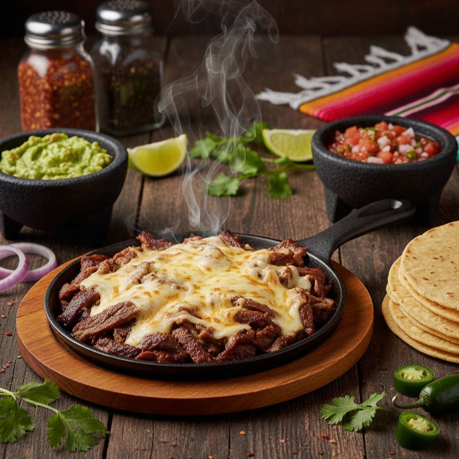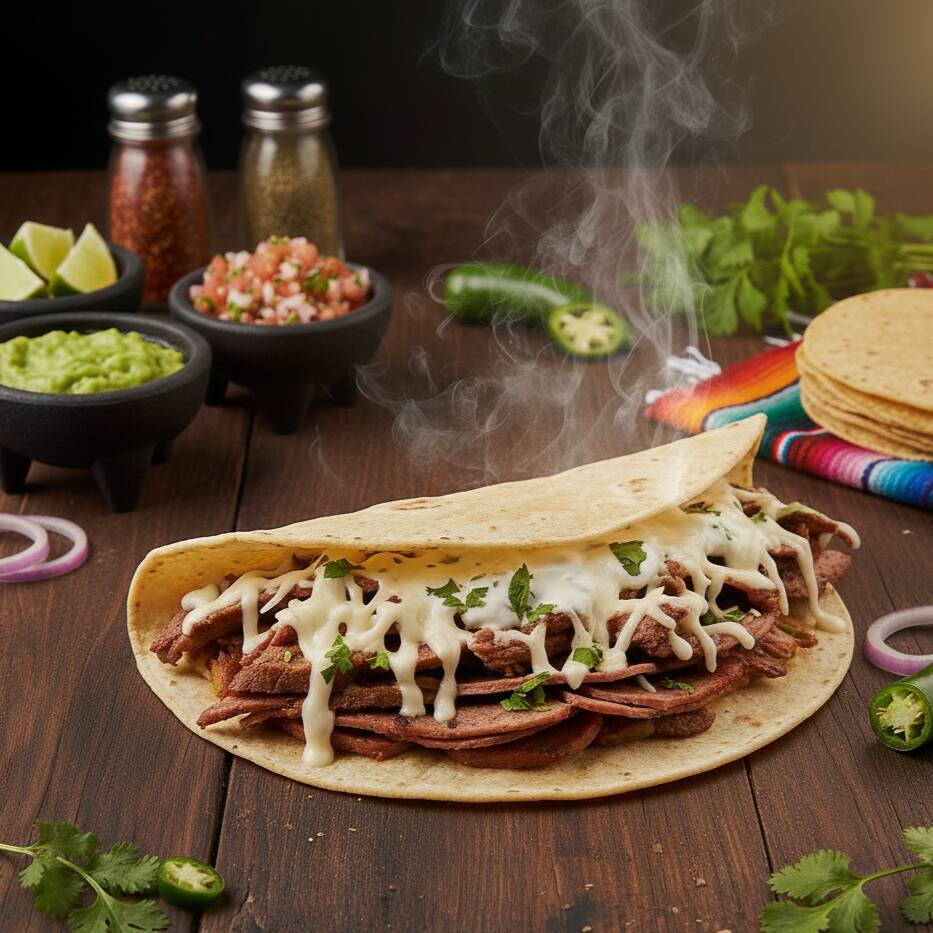 Carne cocinada al punto exacto entre lo asado y lo jugosamente frito, con ese dorado irresistible que despierta el apetito. Cada bocado se acompaña de un toque fresco de pico de gallo y guacamole al punto. No necesitas ver el tamaño para saber que uno no será suficiente.