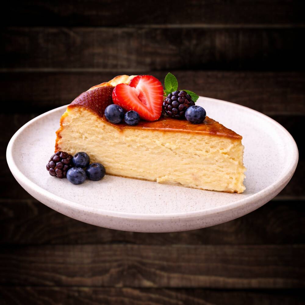Rebanada de cheesecake vasco con exterior dorado y centro cremoso, coronado con frutos rojos frescos que aportan un toque dulce y ligeramente ácido.