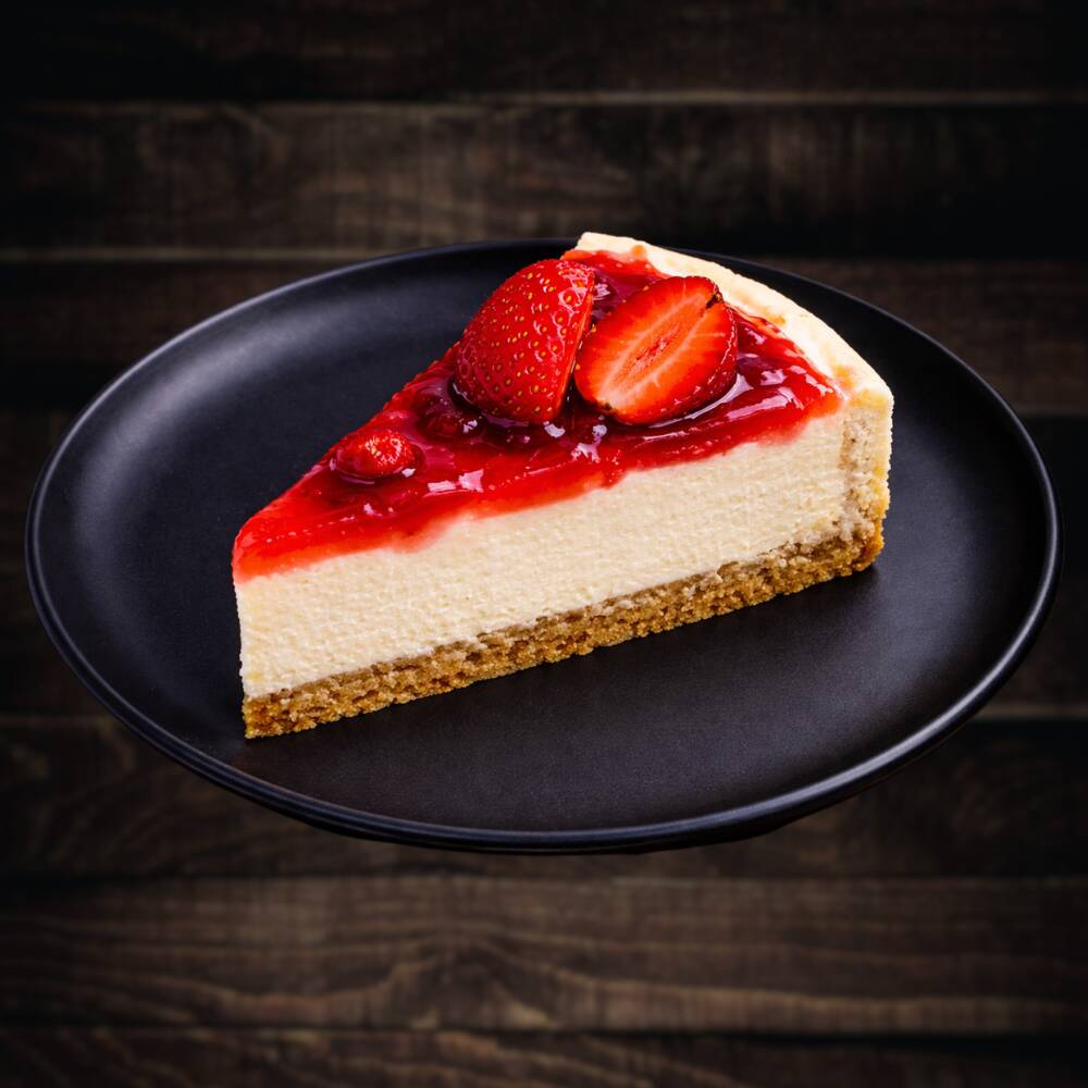 Cheesecake estilo Nueva York, elaborado con Philadelphia de alta calidad sobre una base de galleta, con textura ultra cremosa y horneado perfecto. Cubierto con compota de fresa y fruta natural que aporta un balance ideal.