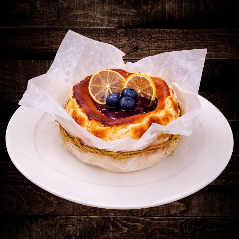 Cremoso cheesecake estilo vasco con interior suave y ligeramente fundente, horneado al punto para lograr una textura dorada e intensa. Acompañado con una capa de blueberry que aporta dulzor y acidez, realzada con un toque cítrico de limón que lo hace fresco y equilibrado.