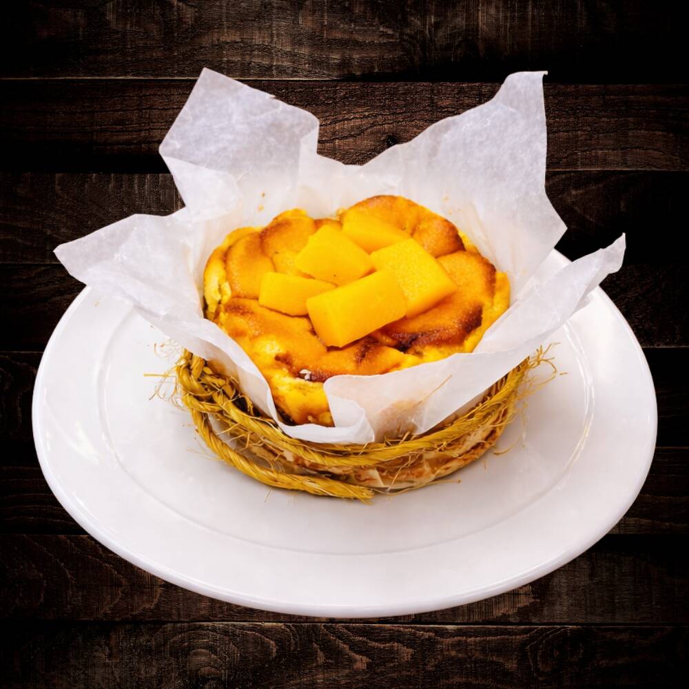 Cremoso cheesecake estilo vasco con interior suave y ligeramente fundente, horneado al punto perfecto para lograr su característico toque dorado. Acompañado con jugosos cubos de mango fresco que aportan un contraste dulce y tropical irresistible.