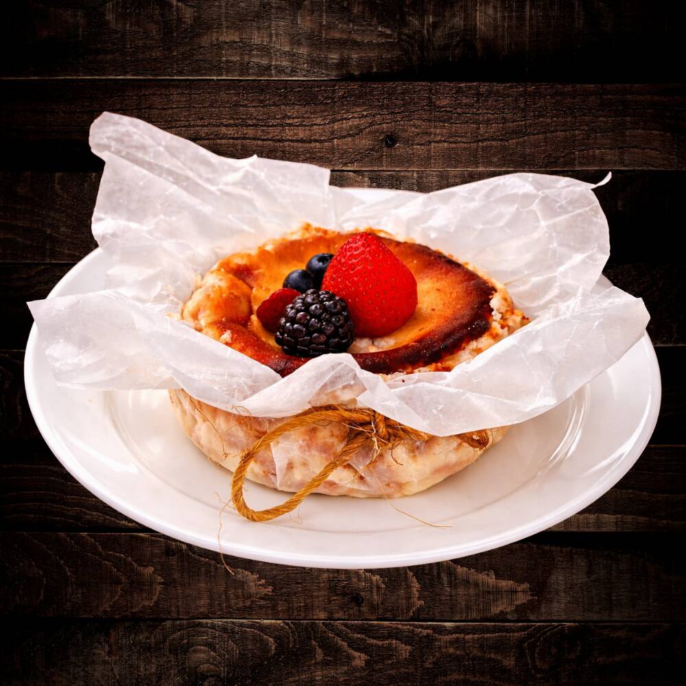 Delicioso cheesecake vasco con superficie ligeramente dorada y centro cremoso e irresistible. Acompañado de una selección de frutos rojos frescos que aportan el balance perfecto entre dulzura y acidez. Un postre elegante, suave y lleno de sabor en cada bocado.