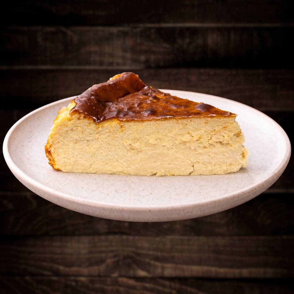Cheesecake vasco, horneado a alta temperatura para lograr un exterior dorado y un centro suave y cremoso, con sabor intenso y perfectamente balanceado.