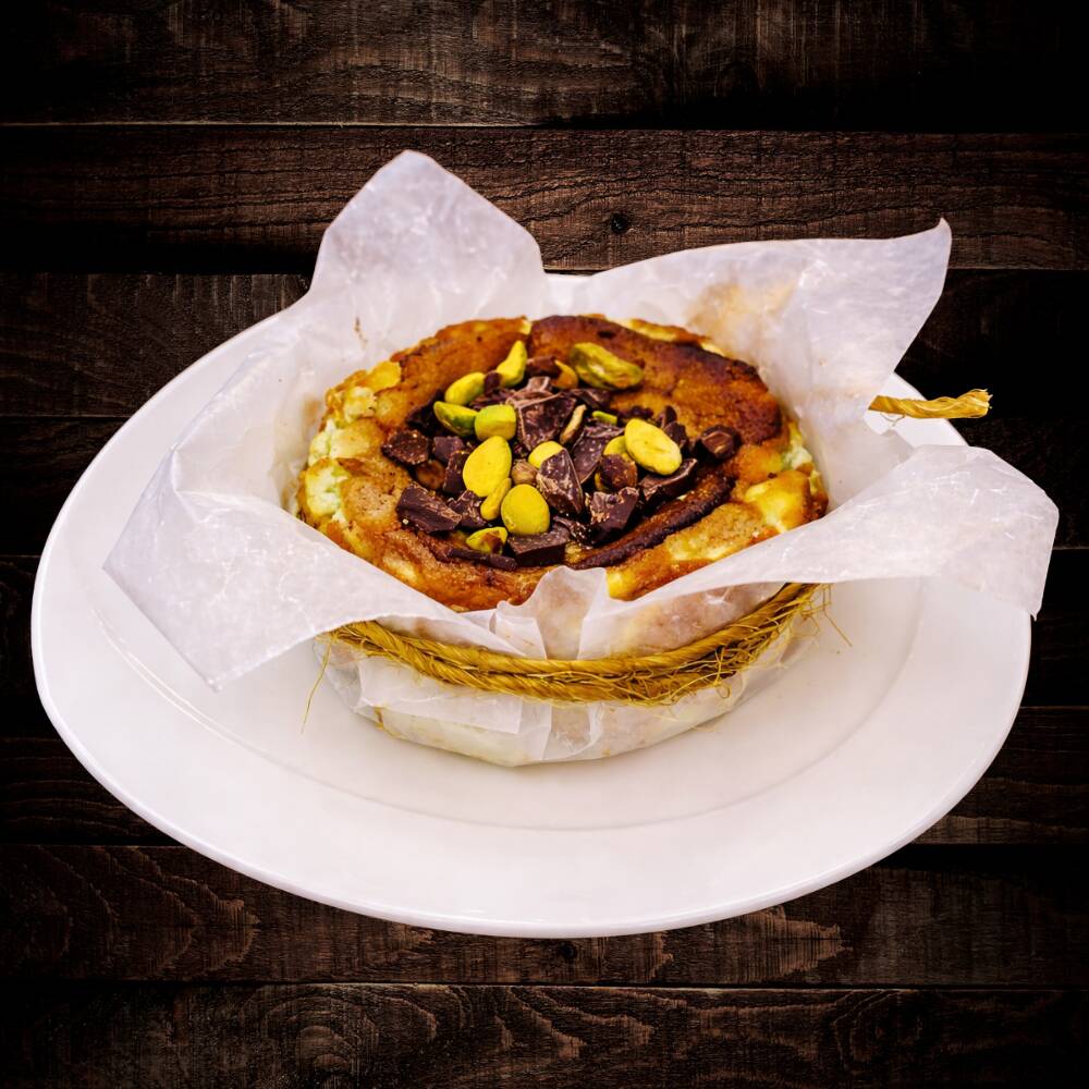 Cremoso cheesecake vasco con interior suave y ligeramente fundente, horneado al punto para lograr una textura intensa y dorada. La combinación de pistache aporta un toque tostado y elegante, mientras que el chocolate semiamargo equilibra con notas profundas y poco dulces.