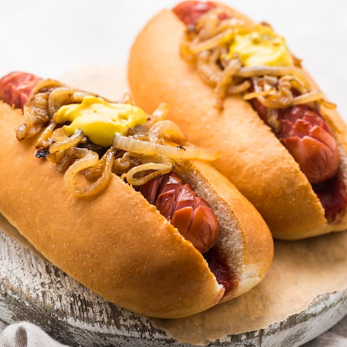 Hot dog hecho con rico pan artesanal, salchicha grande, cebolla caramelizada, vegetales, y aderezos