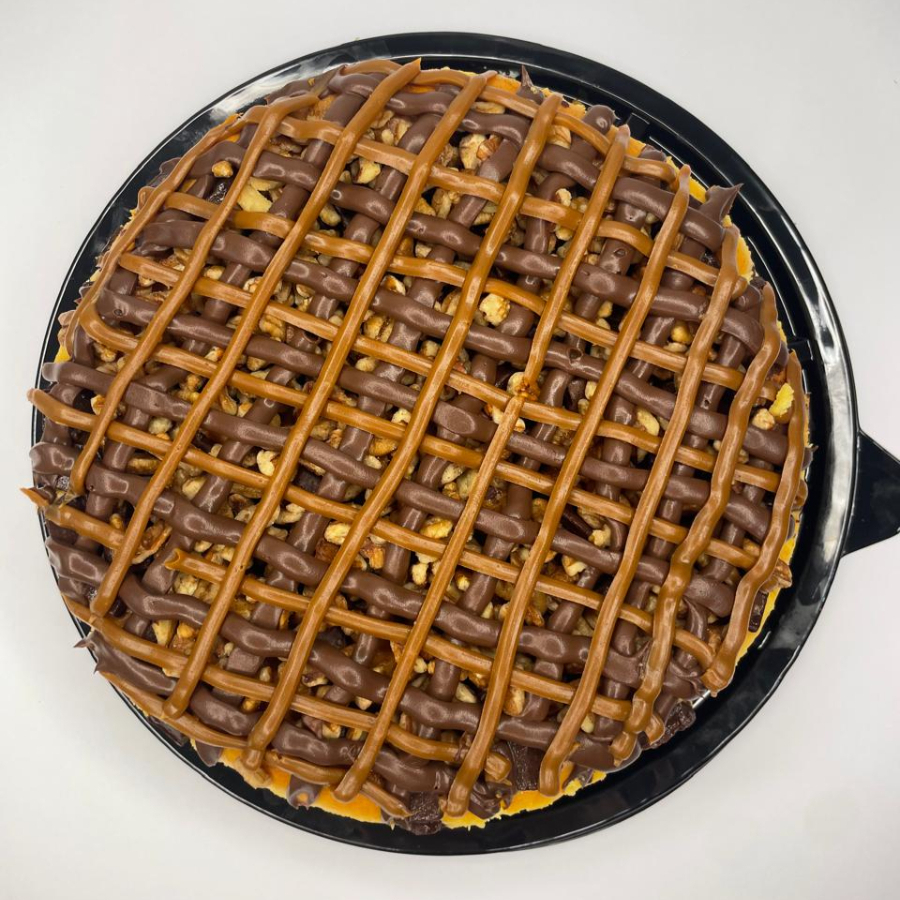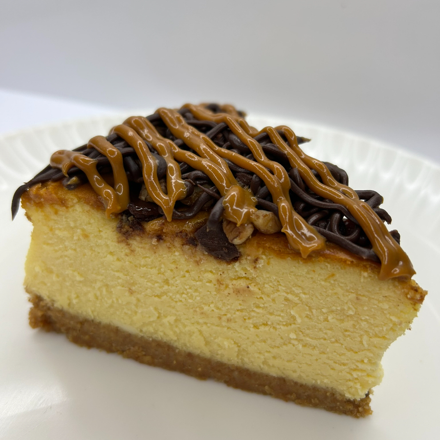 Presenta un relleno de cheesecake de color marfil, firme y perfectamente compacto, sobre una base dorada de galleta. En la parte superior está decorado con hilos generosos de chocolate oscuro y cajeta brillante, acompañados de trocitos de nuez que aportan textura y un acabado gourmet.