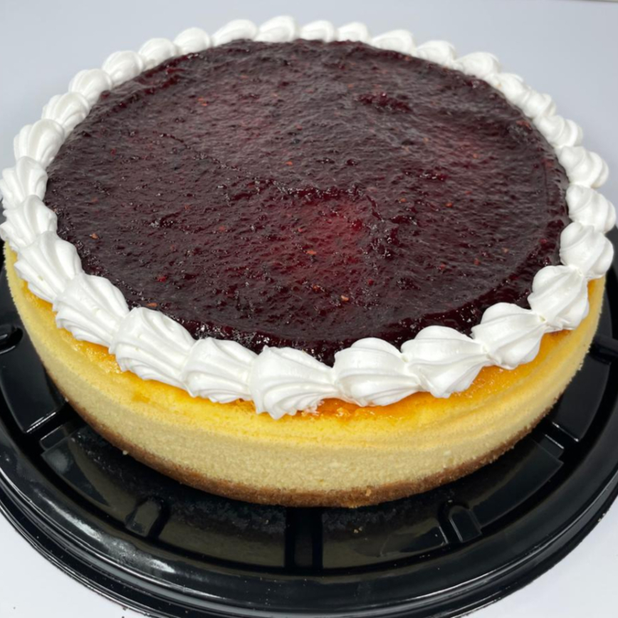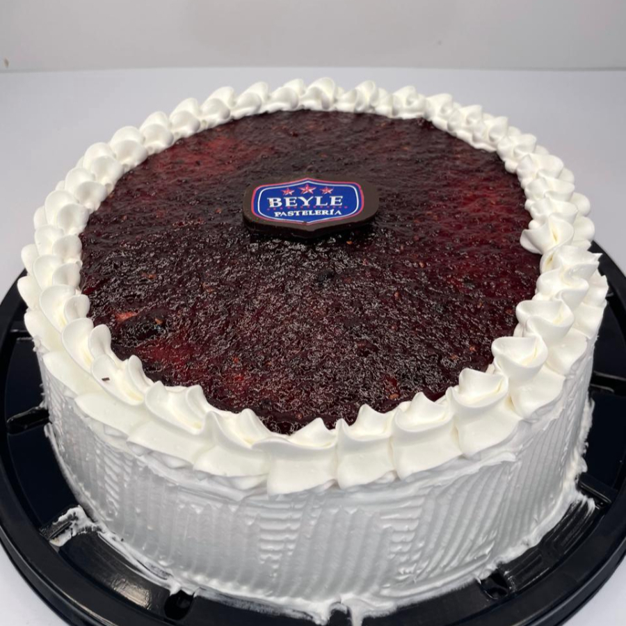 Elaborado con un suave biscocho de vainilla bañado en jarabe de tres leches, relleno de queso crema y cubierto de crema poniendo en la parte superior un espejo de zarzamora.
