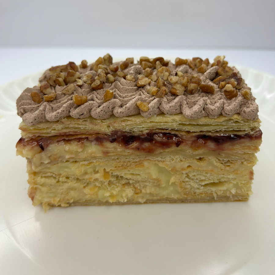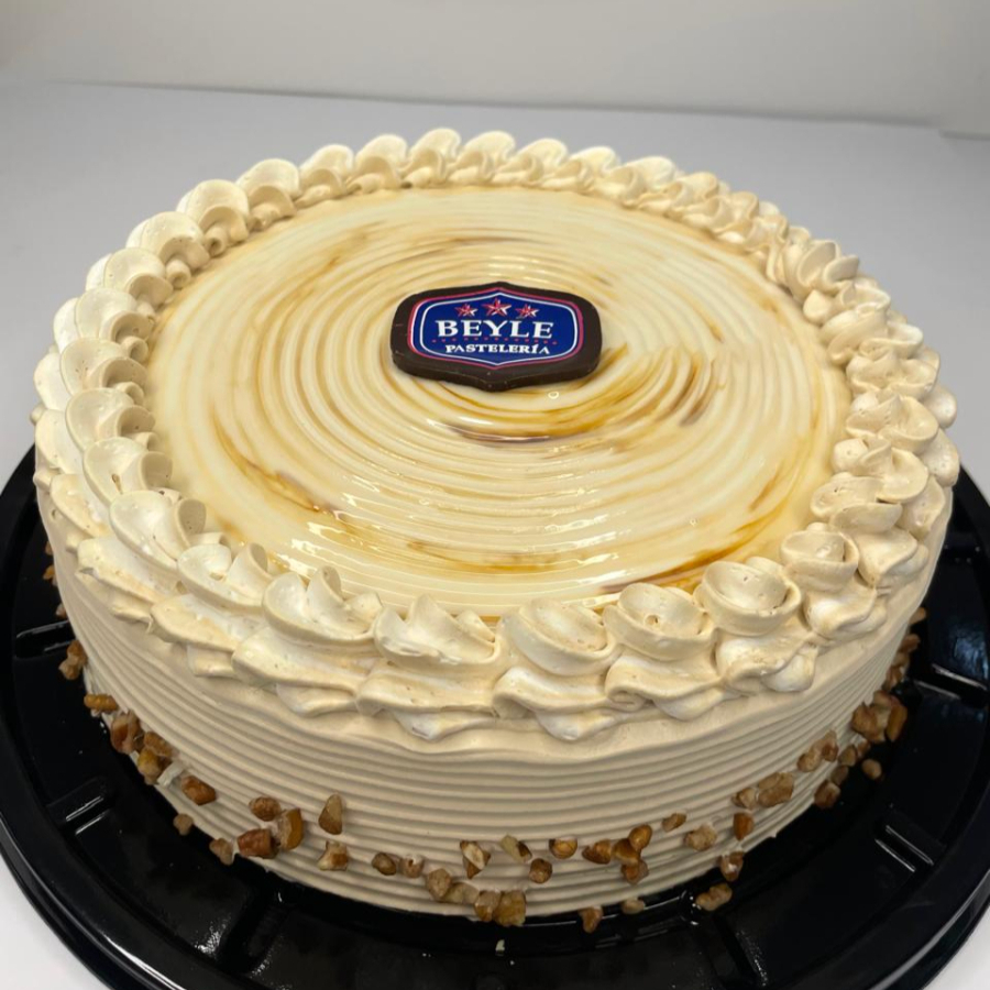 Exquisito pastel artesanal de moka con nuez, elaborado con suave pan esponjoso, relleno y cubierto con cremosa mezcla sabor café y delicados trozos de nuez, creando un equilibrio perfecto entre elegancia, suavidad y sabor intenso.