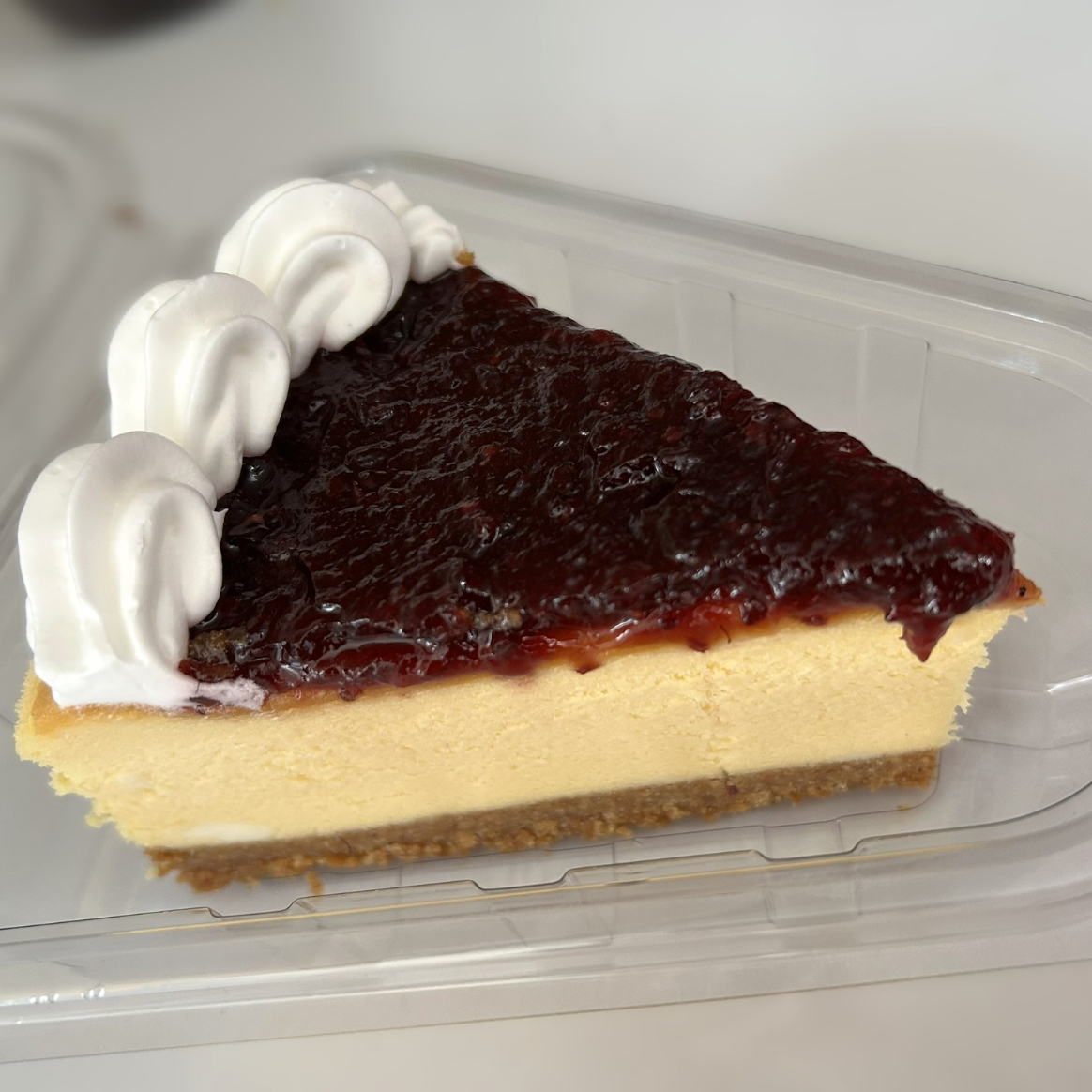 Presenta una capa superior cubierta con una generosa mermelada de zarzamora de color rojo profundo, brillante y con textura natural. Está decorada con delicados rosetones de crema batida que aportan un toque fino y atractivo. La base de galleta dorada completa el contraste perfecto de colores y capas.