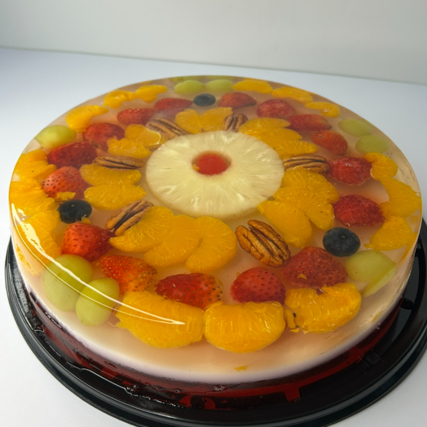 Elegante gelatina artesanal con una fina selección de frutas frescas, presentada en un acabado brillante y cristalino que combina frescura, color y un sabor delicadamente dulce en cada rebanada.