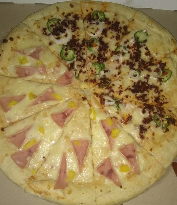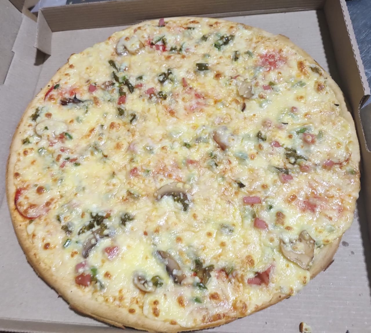 Champiñones, pollo, granos de elote, jalapeños y extra queso.