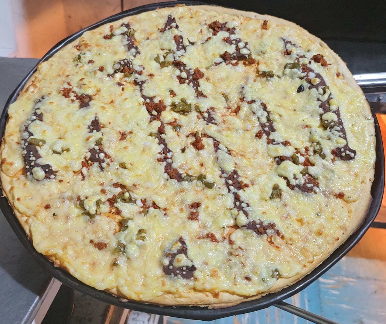 Jamón, pepperoni, cebolla, pimiento verde, chorizo, extra queso.