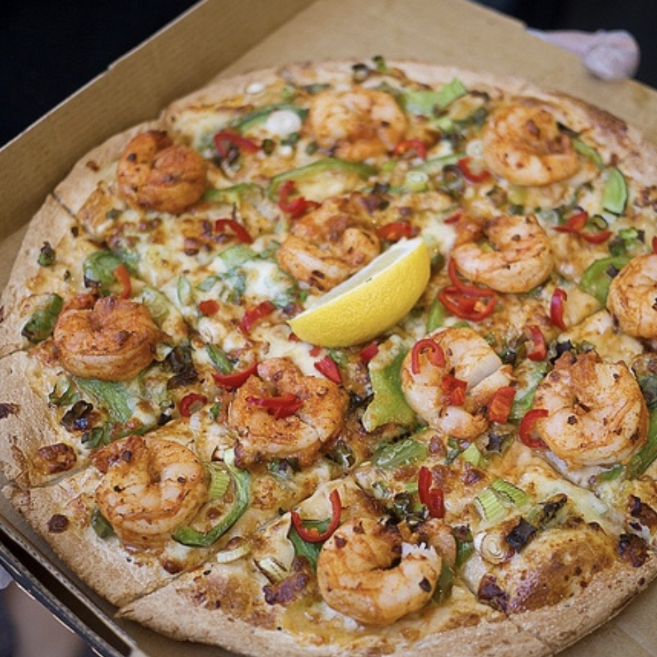Pizza de masa madre, salsa casera con camarones y base de 4 quesos de la casa.