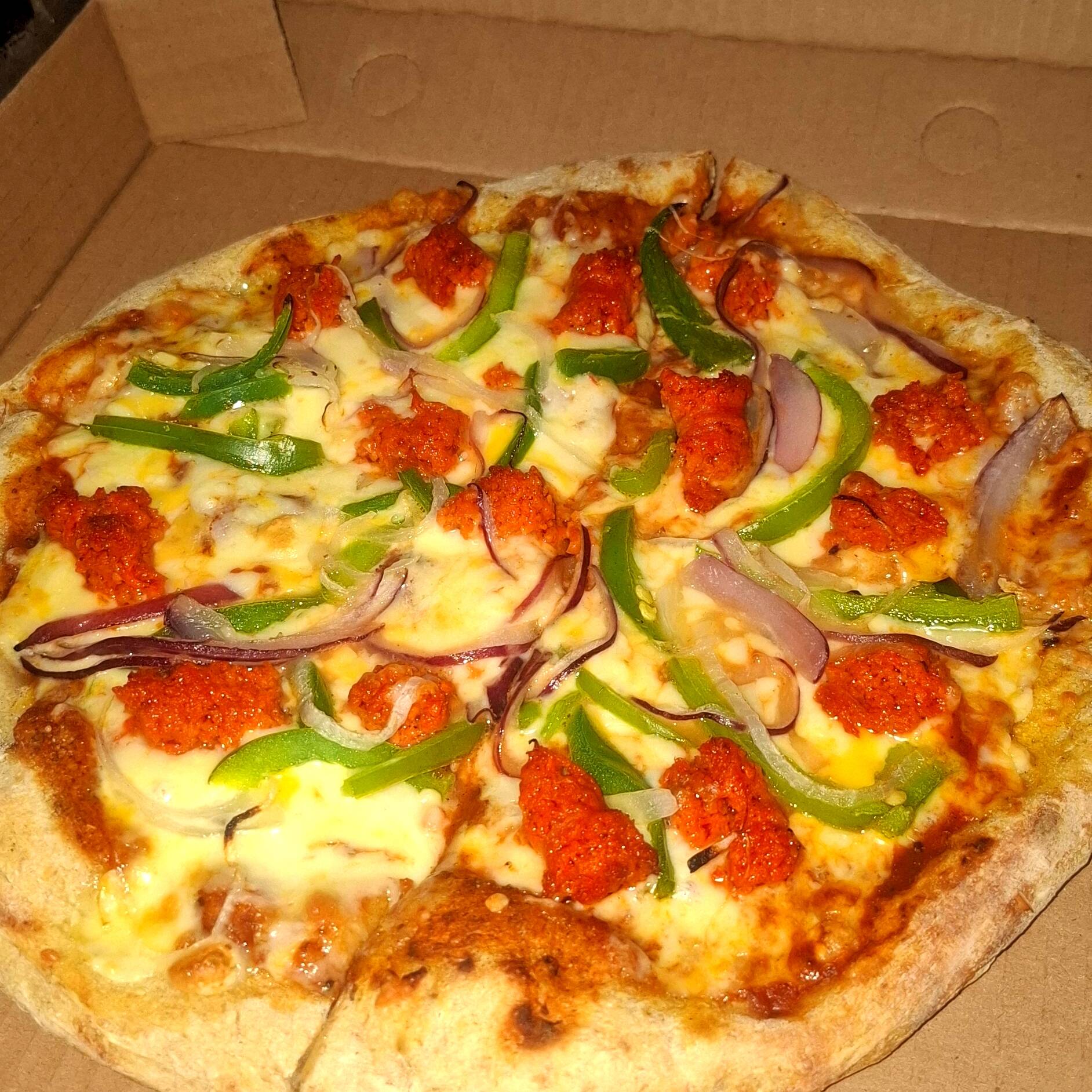 Pizza de masa madre, salsa casera, chistorra, jalapeño, cebolla con mix de 4 quesos de la casa.