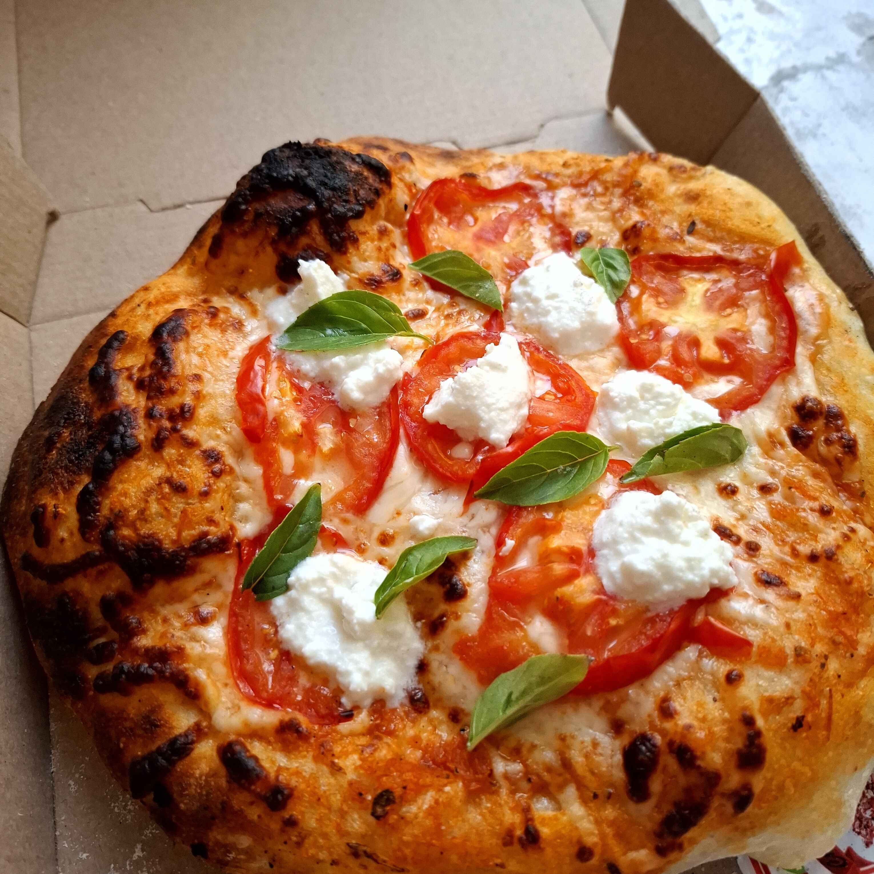 Pizza de masa madre, salsa casera, albahaca, mozzarella, jitomate y mix de 4 quesos de la casa.