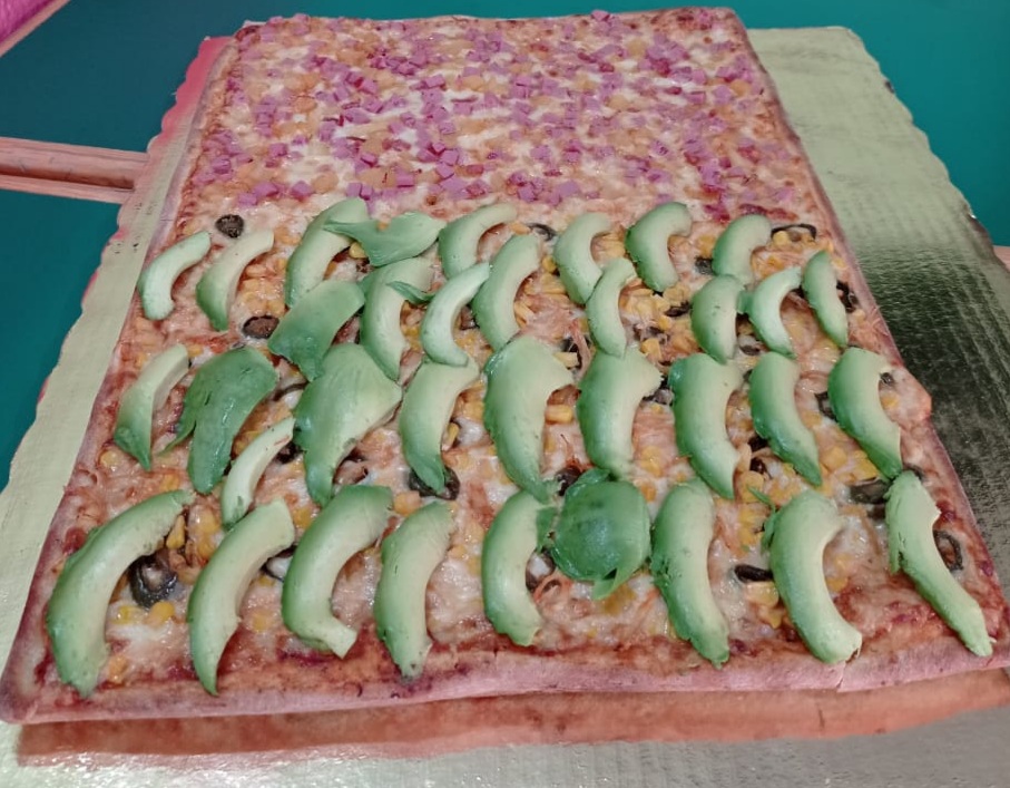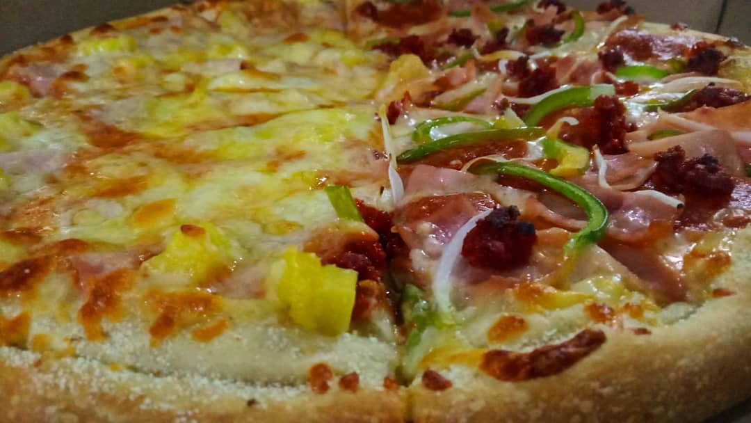 Pizza rectangular Mitad Hawaiana y Mitad Carnes Frias.