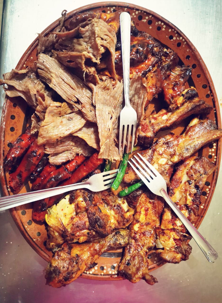 (400gr costilla asada y BBQ, 1/2 pollo asado,200gr arrachera, 200 gr chistorra) incluye frijoles charros y refritos,papas, salsas, ensalada y tortillas