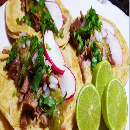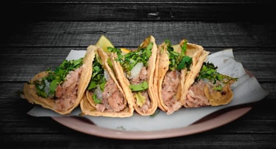 Taco elaborado con doble tortilla de maiz, cabeza, cebolla, cilantro y salsa.