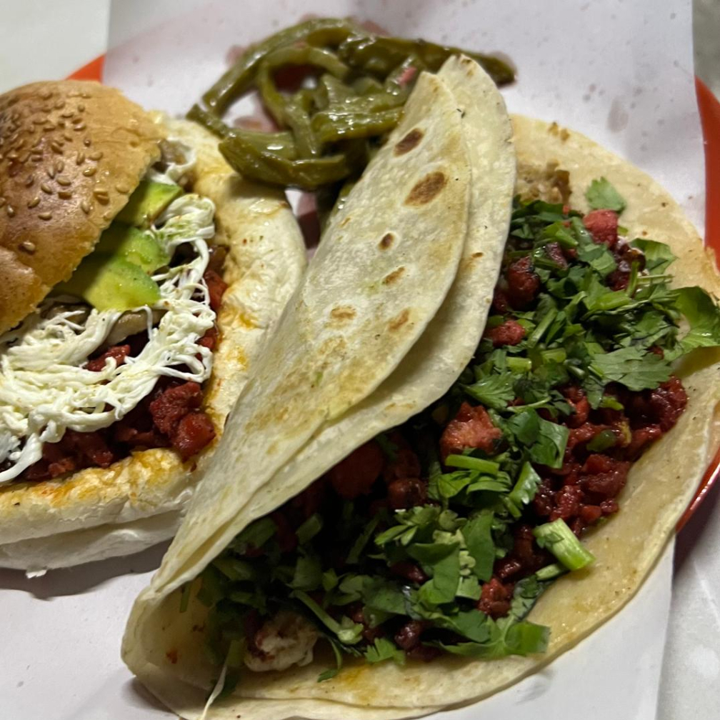 Taco especial de campechano de bistek y enchilada, con tortilla de harina, quesillo y aguacate