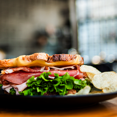 Pan de masa madre, jamon serrano, jamon de pavo, queso manchego o gouda, sobre una cama de lechuga italiana
