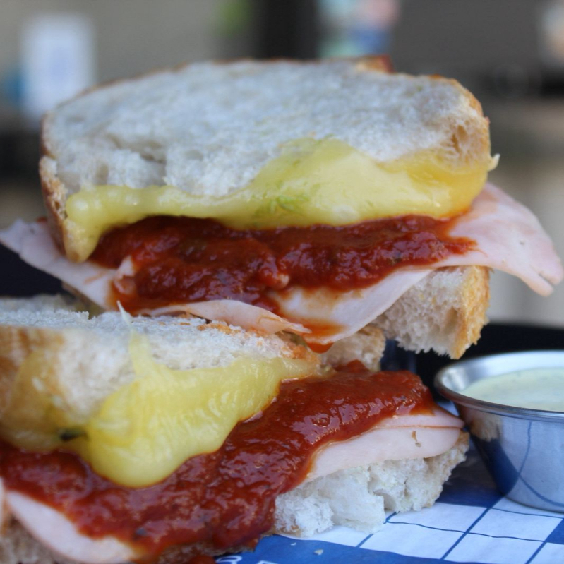Pan de masa madre, jamon de pavo, queso gouoda, salsa de tomate acompañado de aderezo de yogurt griego