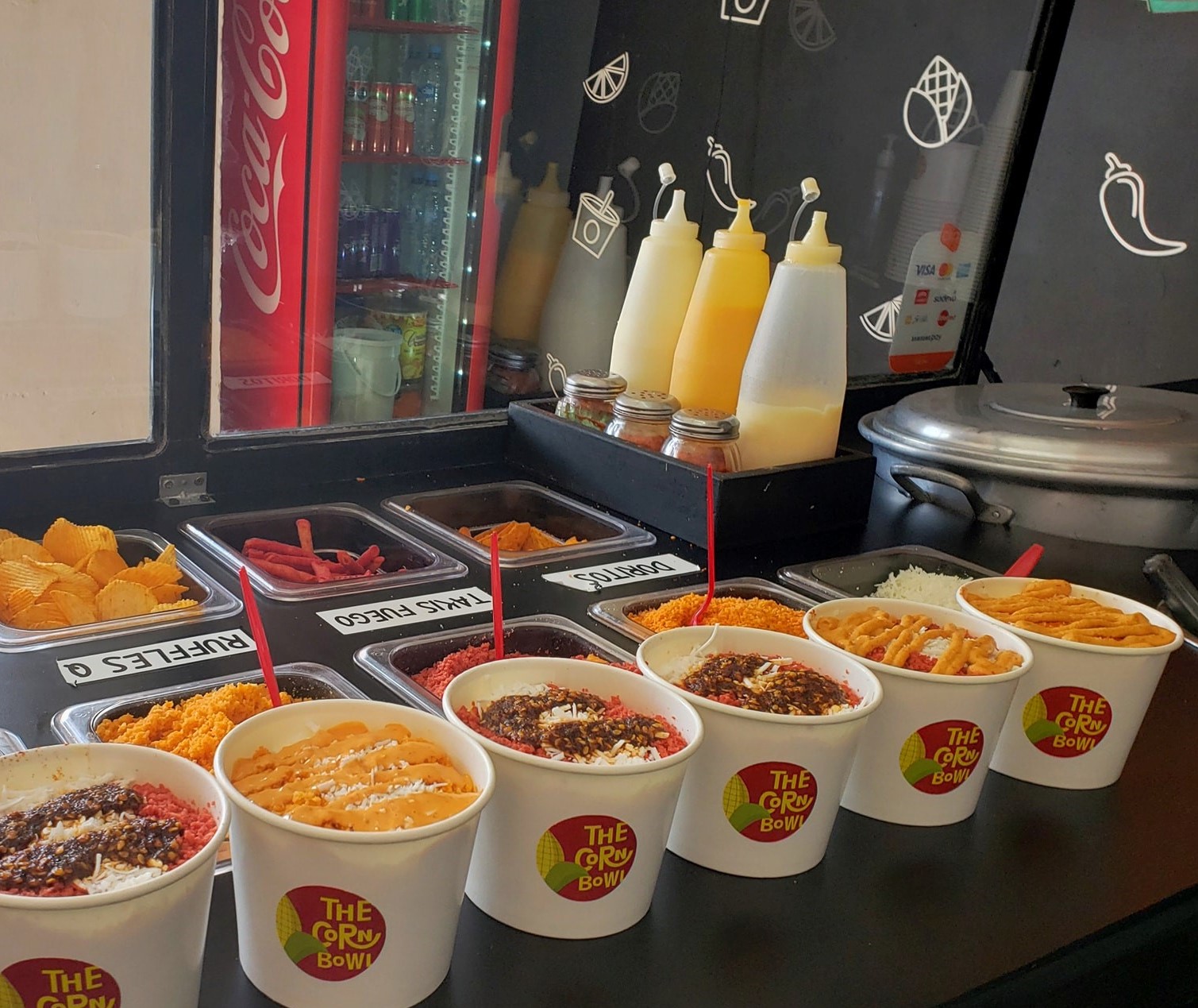Arma tu esquite con tus ingredientes . Todos incluyen mayonesa, queso cheddar, queso rallado, limón y crema.