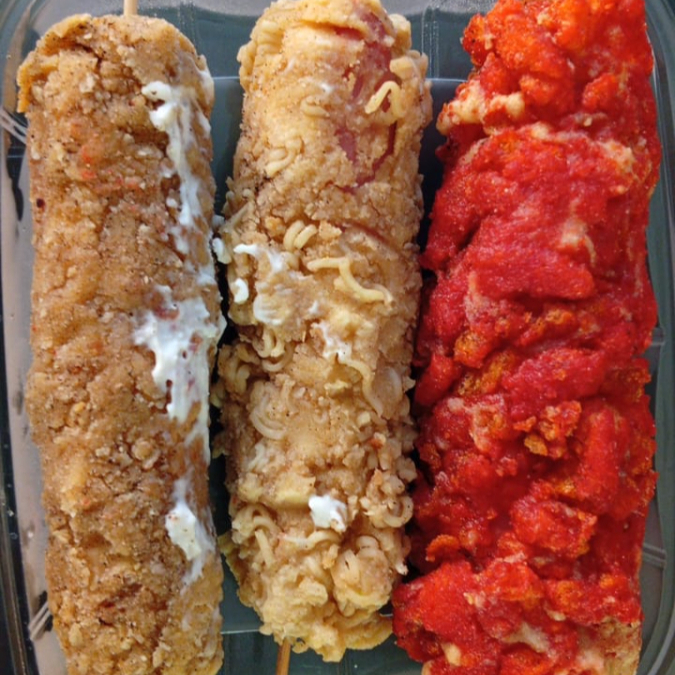 1 Banderilla Coreana, 1 Banderilla Ramen, 1 Banderilla Flaming Hot. Incluye 1 aderezo chipotle grande y 1 aderezo catsup grande