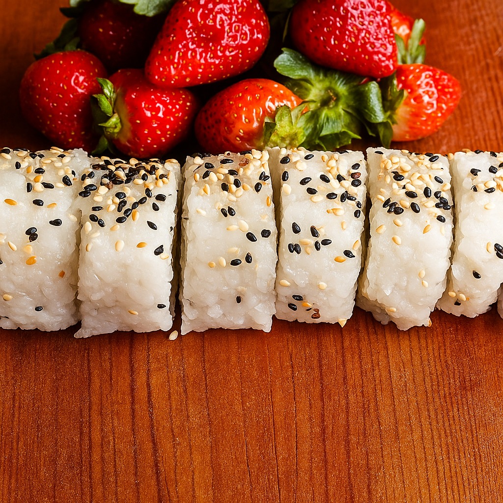 Rollo relleno de surimi, alga, pepino, aguacate, cubierto de Philadelphia (extra) y ajonjolí.
