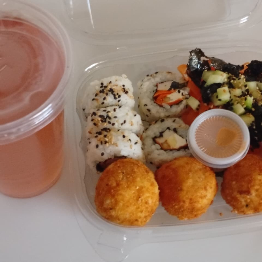 Esferas con arroz Yakimeshi, empanizadas, incluye aderezo de chipotle.