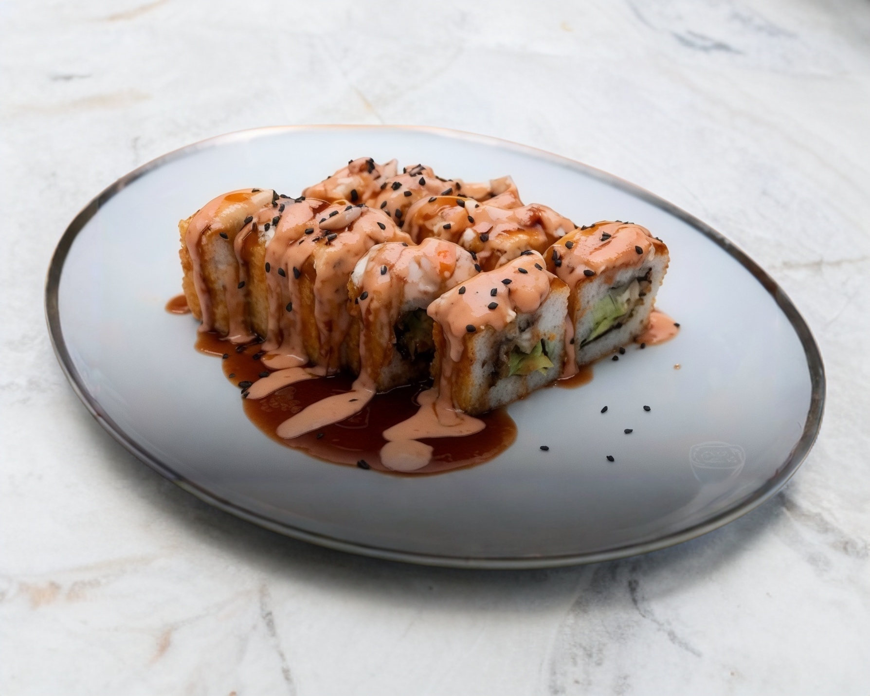 Pd: Res y aguacate Pf: Empanizado, philadelphia, camarón, bbq, aderezo chipotle y ajonjolí. Porcion de 230 grms