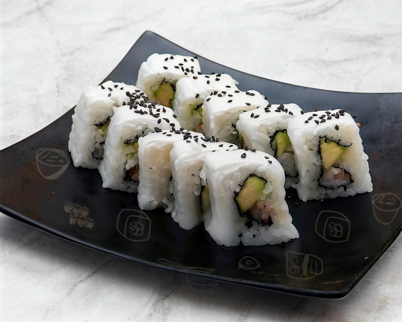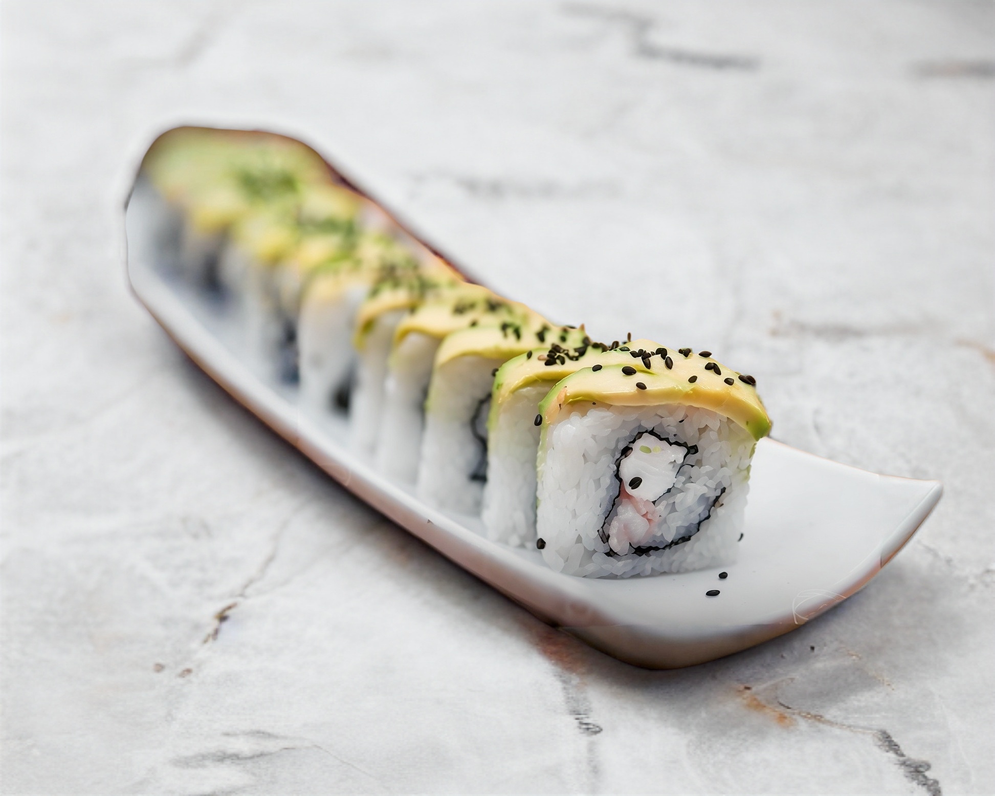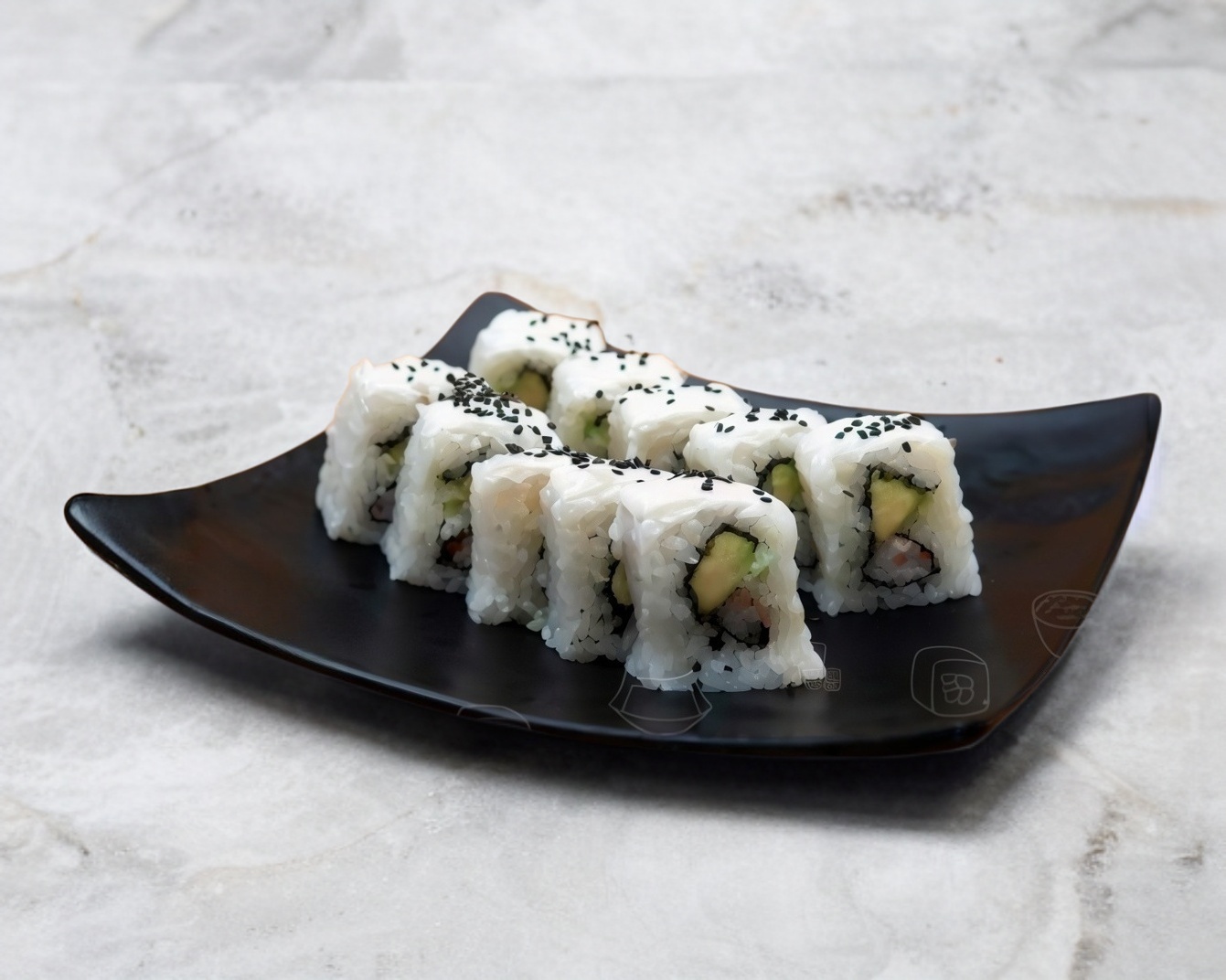 Por dentro aguacate, camarón empanizado y tampico. Por fuera Philadelphia y ajonjolí. Porcion de 230 grms