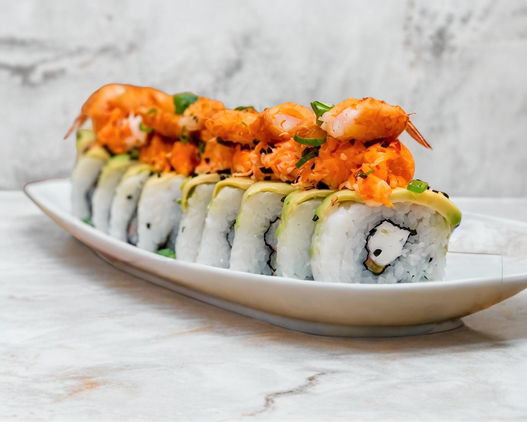 Por dentro camarón y aguacate. Philadelphia y plátano por fuera, decorado con tampico, cebollín, ajonjolí y Sriacha. Porcion de 230 Grms