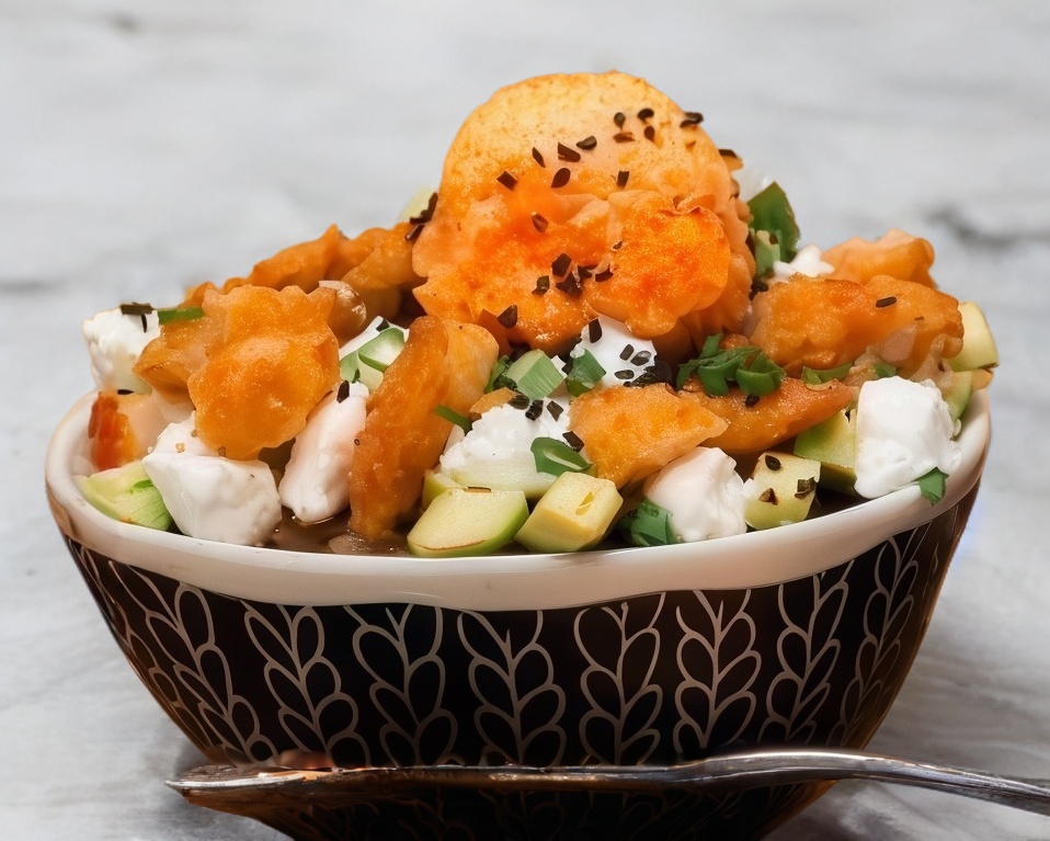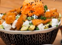 Arroz frito con verduras decorado con Philadelphia, aguacate, res y camarón empanizado.