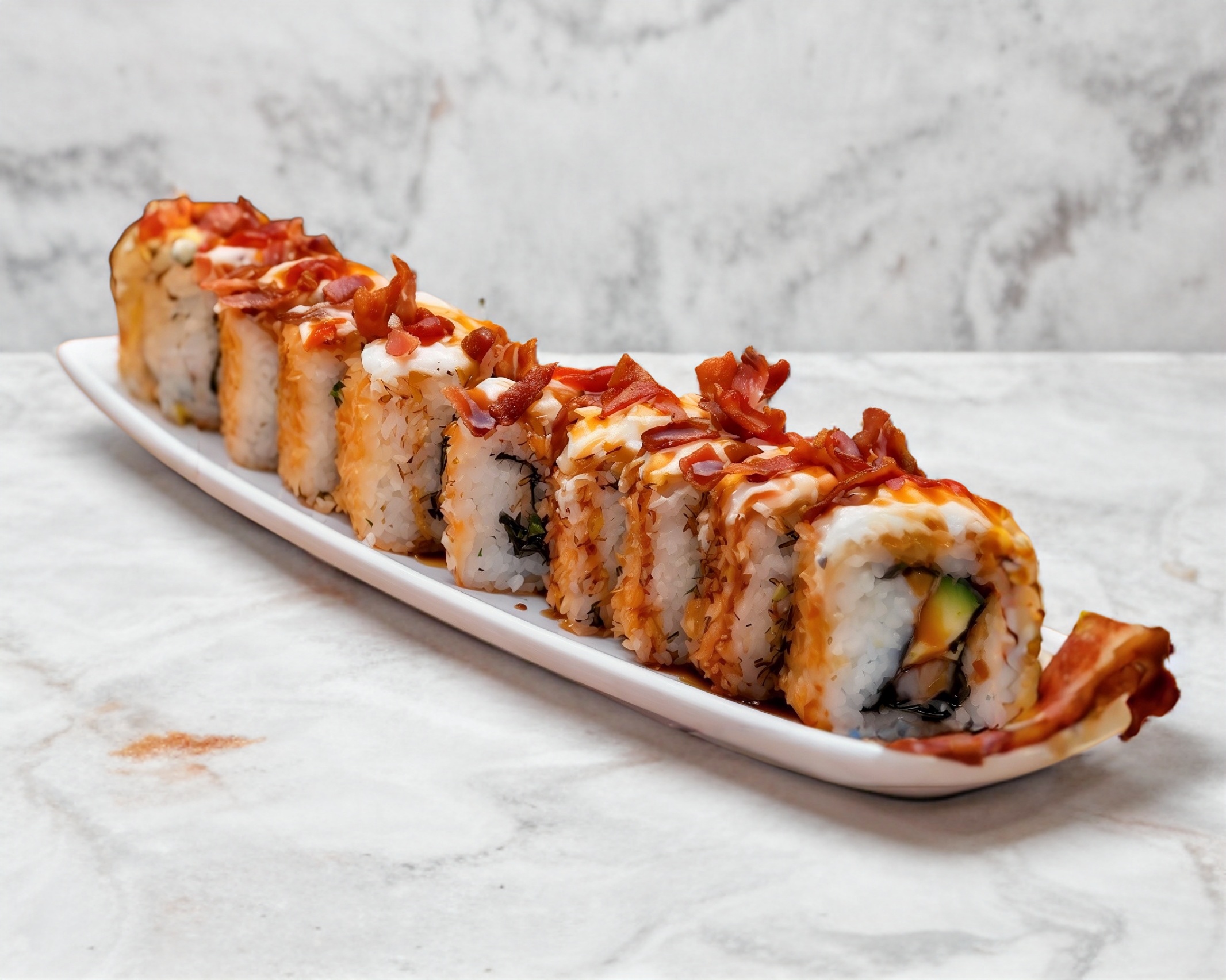 Pd: Camarón y aguacate Pf: Empanizado, philadelphia, tocino, anguila, siriracha y ajonjolí. Porcion de 230 grms
