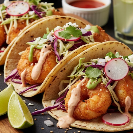Camarón fresco envuelto en un capeado dorado y extra crujiente. Lo servimos sobre una tortilla de maíz calientita, con el toque fresco de repollo, salsa de tomate con habanero, cebolla desflemada y un aderezo cremoso.