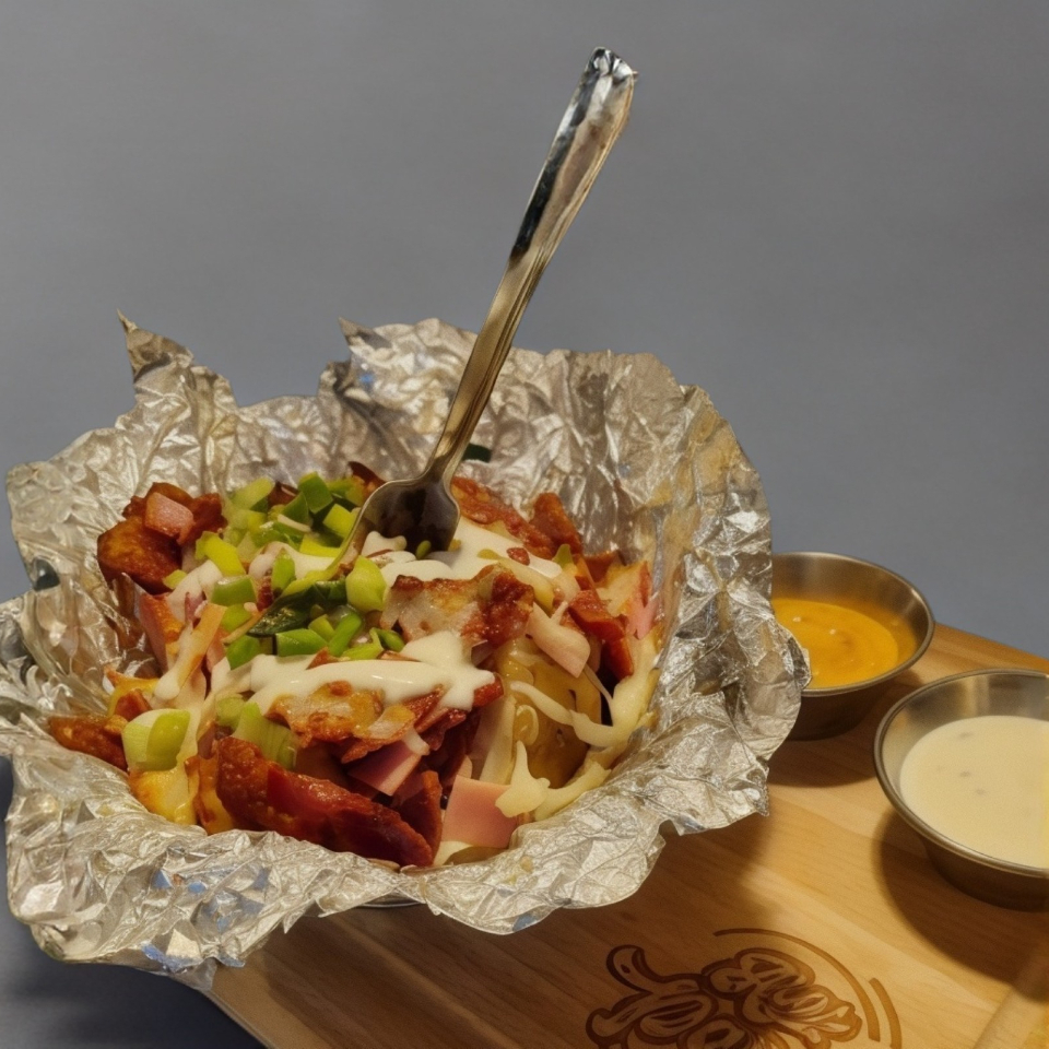 Deliciosas Papas 100% frescas y Naturales Sazonadas al momento bañadas en queso amarillo , tocino y un toque de cebollin