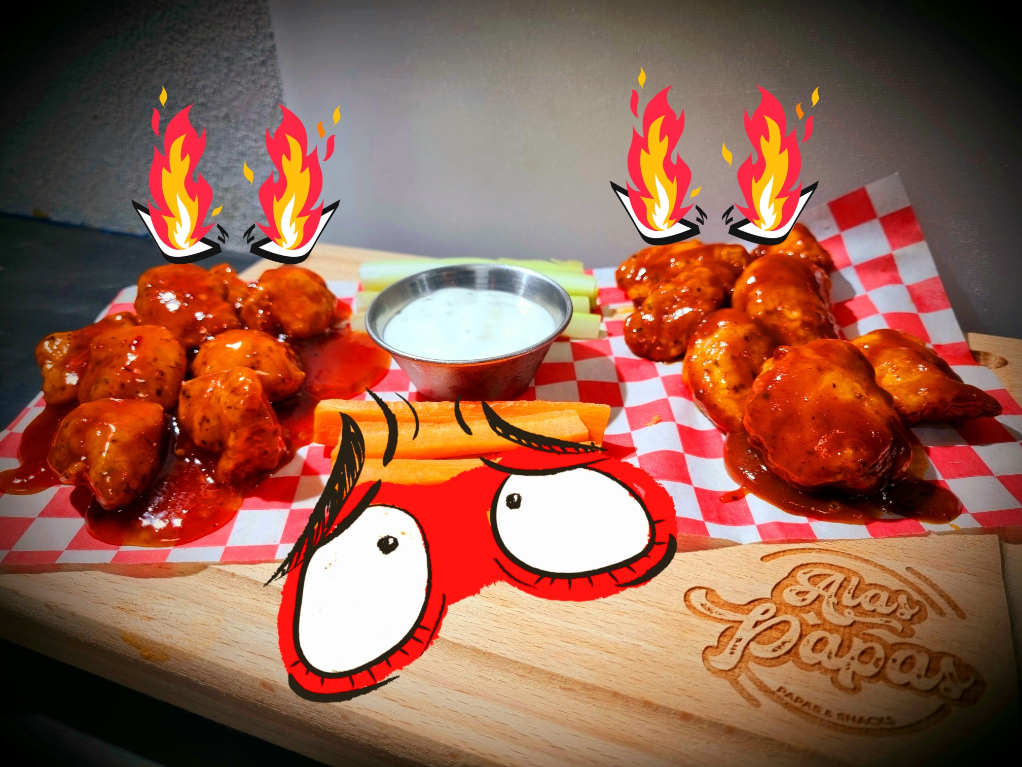 Deliciosas alitas con la salsa de tu preferencia acompañadas de ranch , zanahoria y apio