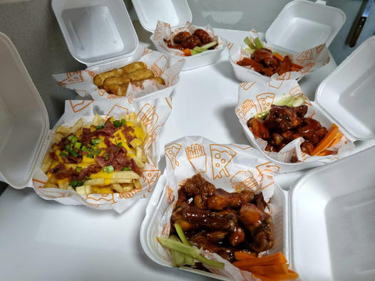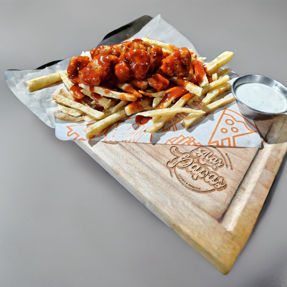 Deliciosas Papas 100% frescas y Naturales Sazonadas al momento acompañadas de boneless 100% pechuga y bañadas en salsa de tu preferencia