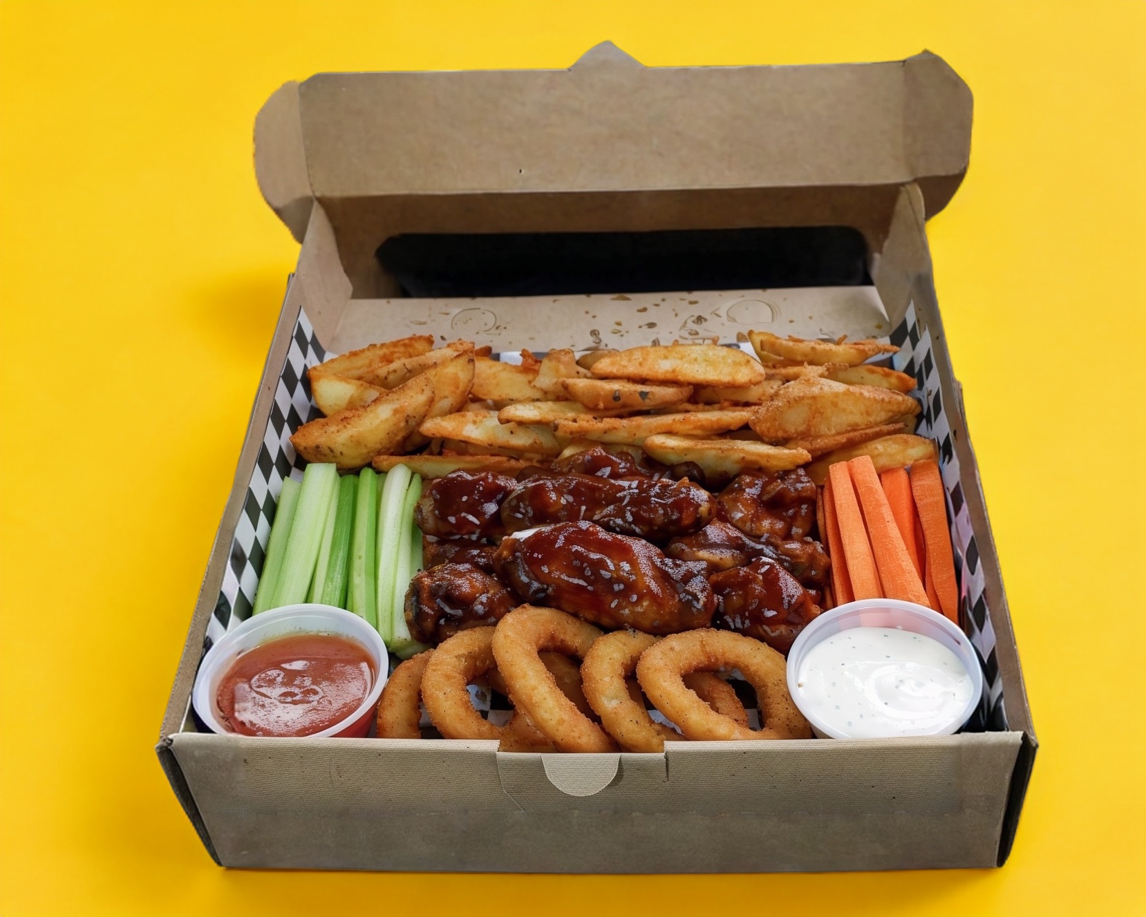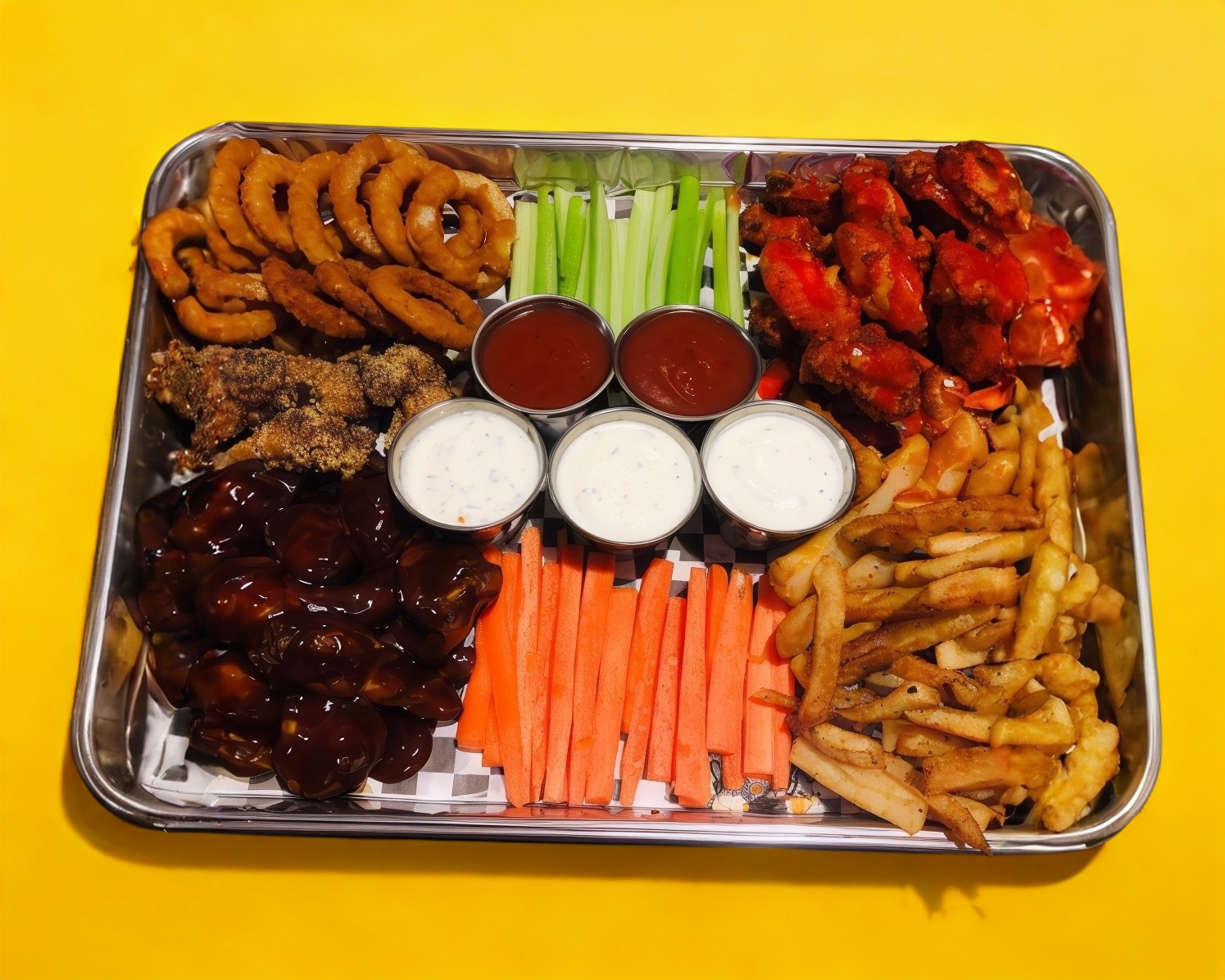 45 alitas, 1 ord papa gajo, 1 ord papa francesa, 1 ord de aros de cebolla, aderezo, catsup y vegetales.