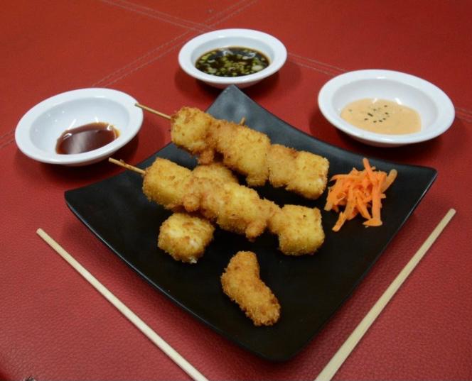 Brochetas de queso y camarón empanizadas