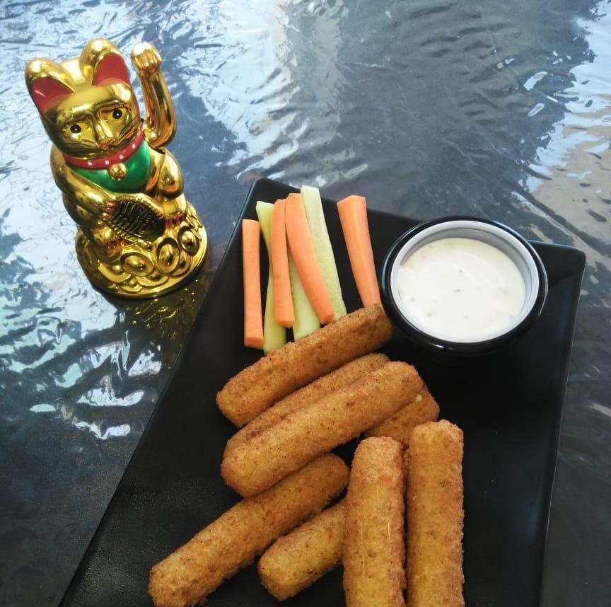 Deliciosas tiras de queso empanizadas, acompañadas de verduras y una porción de aderezo ranch.