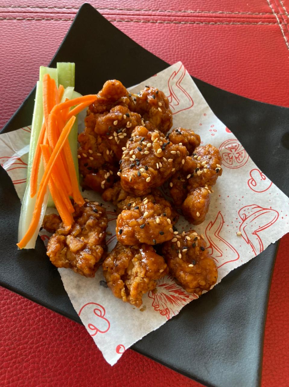 220gr. de trozos de pollo bañados en salsa BBQ, acompañadas de verdura y una porción de aderezo ranch