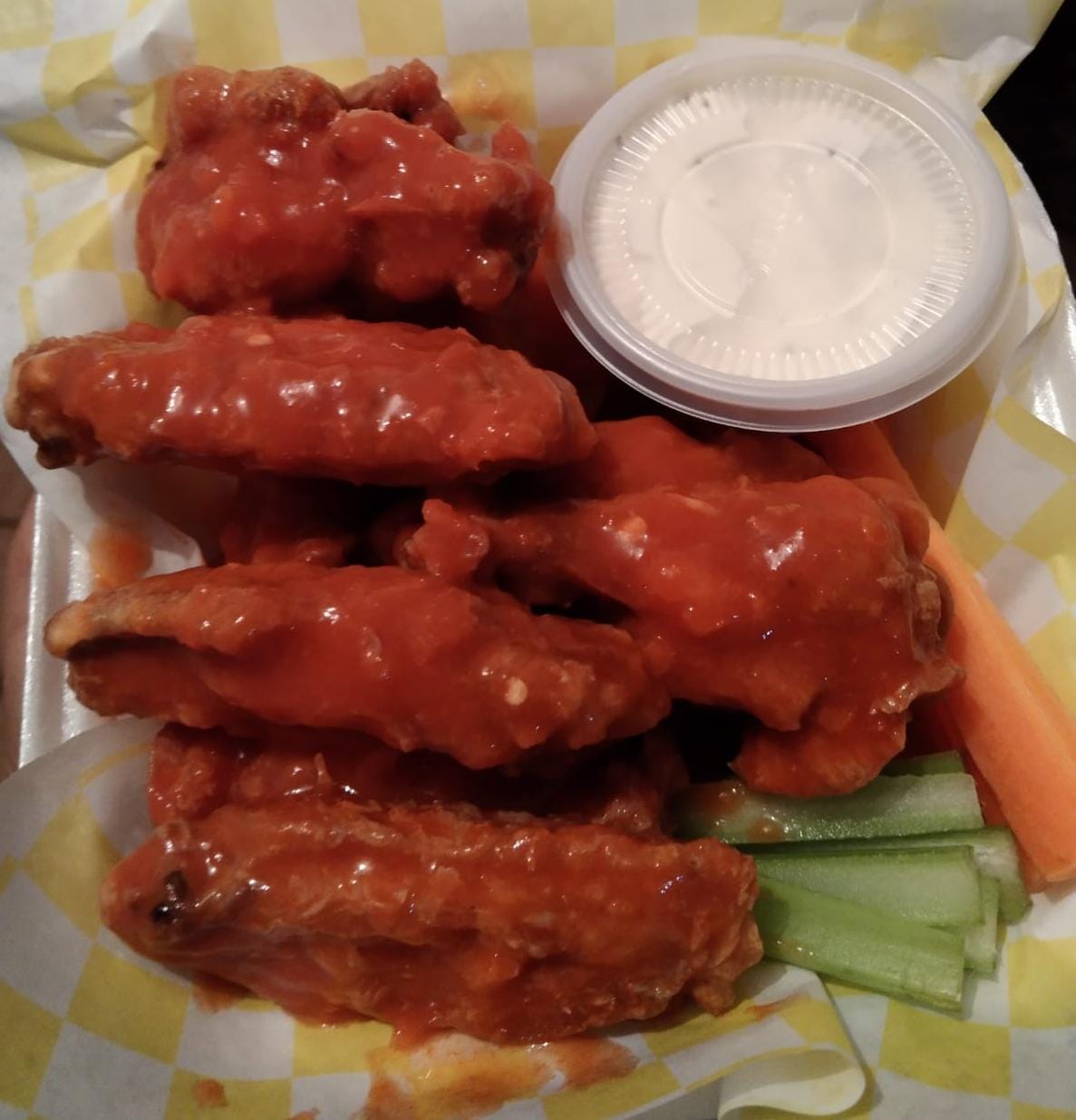 Alitas bañados con salsa de tu preferencia acompañados de salsa ranch, y zanahoria